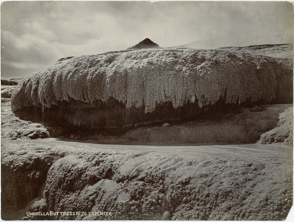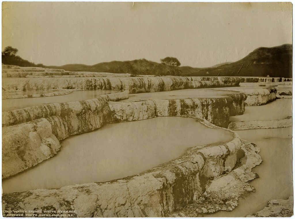 The photographer was Charles Spencer (born England 1854 – died New Zealand 1933). A Tauranga and later Auckland based photographer, Spencer was commissioned immediately after the eruption by the Director of the New Zealand Geological Survey to travel with him and record what was to be found. As Spencer had previously recorded the area, and especially the Pink and White Terraces, he was well placed to record the devastation.